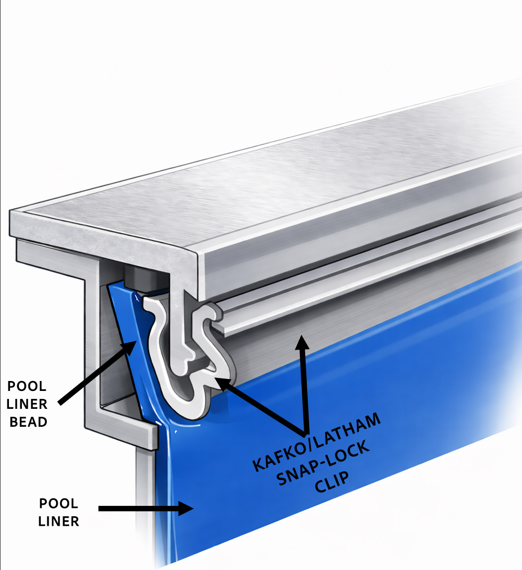 Kafko & Latham Snap-Lock Clip liner retainer is used in conjunction with the Kafko Coping by Latham to ensure your new or replacement inground liner is secured at the liner bead around the entire perimeter of the pool. Replacing the Snap-Lock Clip is required when replacing an inground liner in any Kafko Pool by Latham. The PVC Snap-Lock Clip is used on both Aluminum and PVC Coping Styles. Snap-Lock Clip is designed to secure and ‘lock’ the liner bead into the coping track and preventing the liner for pulling out or away from the liner retainer track.